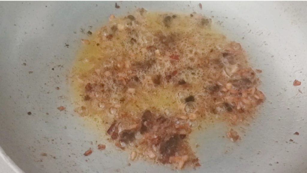 Na panela, refogue em fogo baixo alho, óleo e pimenta, após cerca de 2/3 minutos adicione os filetes de anchovas e refogue por mais 2 minutos até derreterem.