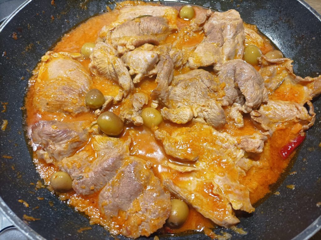 Enquanto isso, dissolva o extrato de tomate na água e despeje sobre a carne, retire o alho e adicione as azeitonas, a pimenta e o sal. Cubra e cozinhe em fogo baixo por cerca de 20 minutos.
