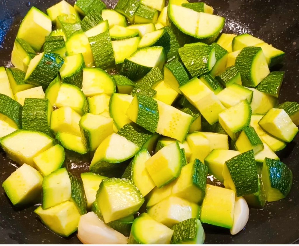Em uma panela, coloque um fio de azeite e um dente de alho, adicione as abobrinhas e refogue por 3 minutos.