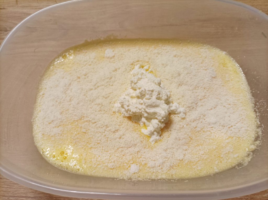 Bata os ovos e tempere com sal, pimenta, queijo parmesão e ricota.