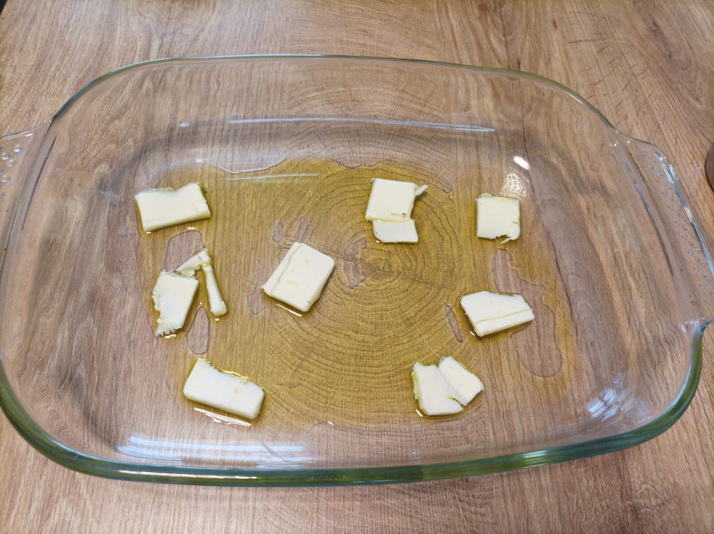 Misture bem e reserve. Prepare uma assadeira com óleo e manteiga em pedaços.