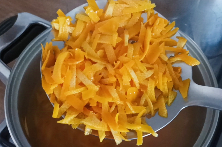 Ao mesmo tempo, encha uma panela pequena com água, deixe ferver e adicione as cascas cortadas, cozinhe por 3 minutos. Depois, escorra e reserve.