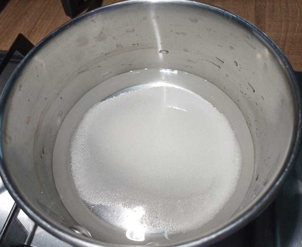 Na panela pequena, coloque água e açúcar, acenda o fogo e deixe derreter. Você precisará do termômetro para medir a temperatura e não aquecer demais.