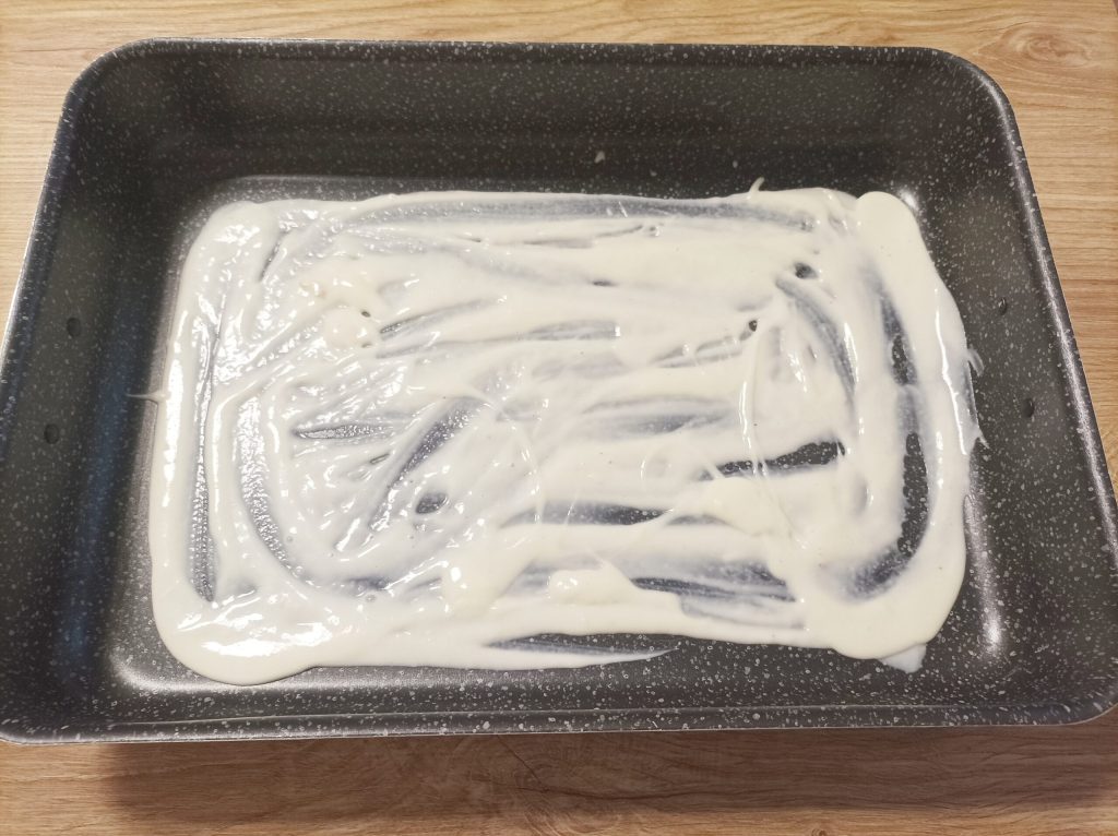 Comece colocando o bechamel e o ragu no fundo da assadeira.