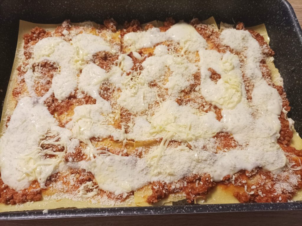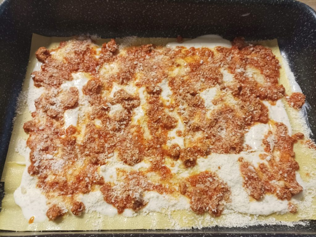 Então comece a formar as várias camadas. Primeiro a massa, depois o bechamel, o ragu e o parmesão.
