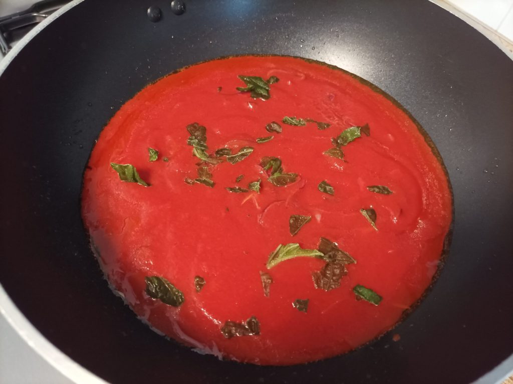 Assim que a cebola estiver murcha, adicione o molho de tomate e o manjericão, cubra e deixe o molho reduzir, levará cerca de 20 minutos.