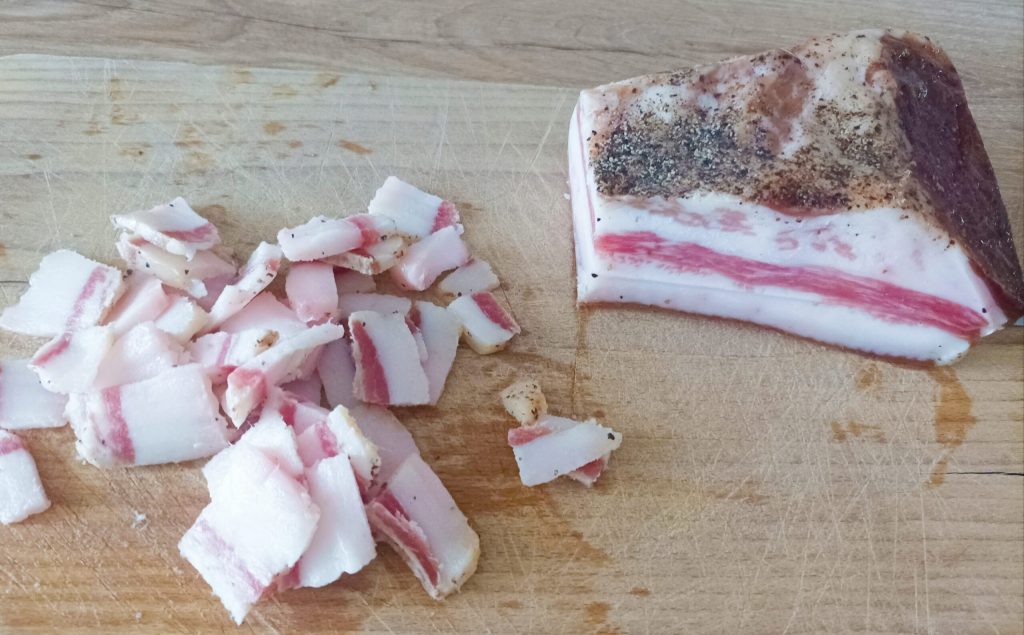 Depois, antes de cortar o guanciale em fatias, retire a pele e a superfície com a pimenta.