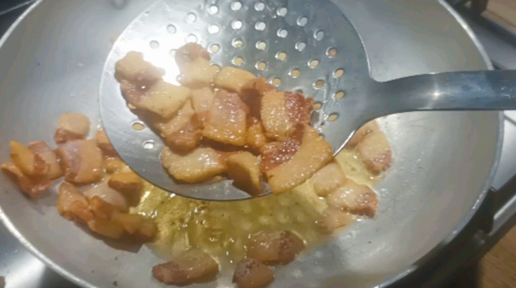 Na frigideira, coloque o óleo, aqueça-o e adicione o guanciale, abaixe o fogo ao mínimo e deixe-o tostar com paciência, sem queimar. Enquanto isso, em uma panela coloque água para cozinhar a massa.