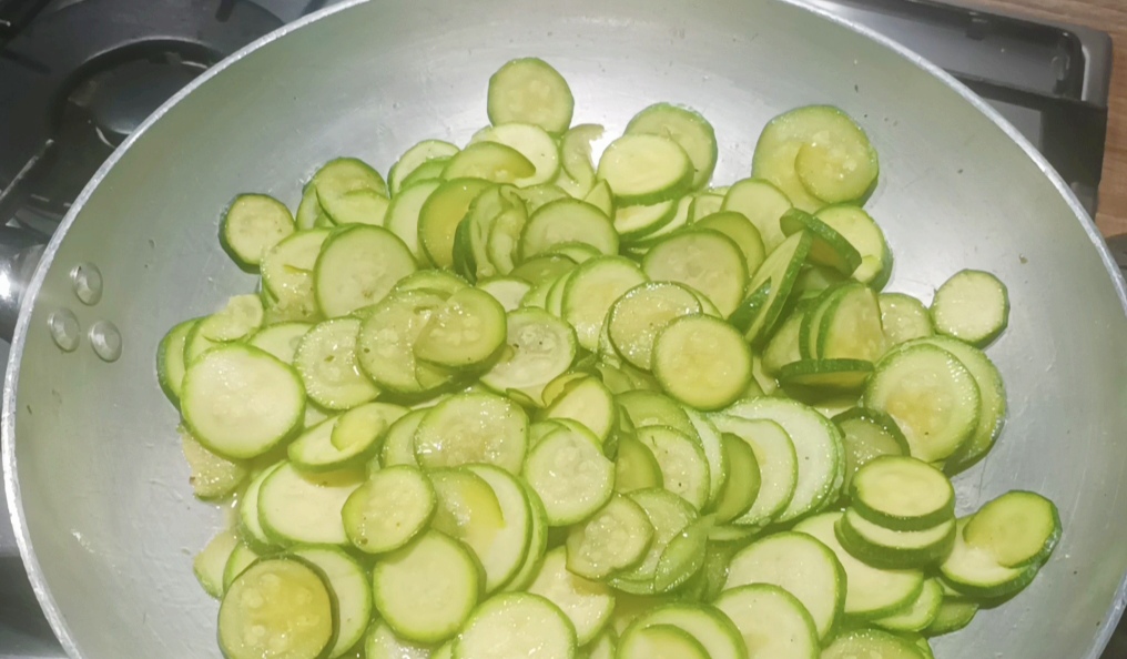 Quando o guanciale estiver pronto, retire do óleo e reserve, pegue as abobrinhas em rodelas e adicione-as na frigideira com o óleo, coloque um pouco de sal (não exagere por causa do guanciale e do pecorino) e a pimenta, cubra e em fogo médio/baixo deixe cozinhar por cerca de 7/8 minutos. As abobrinhas não devem cozinhar demais, mas também não podem estar duras, então prove e ajuste ao seu gosto.