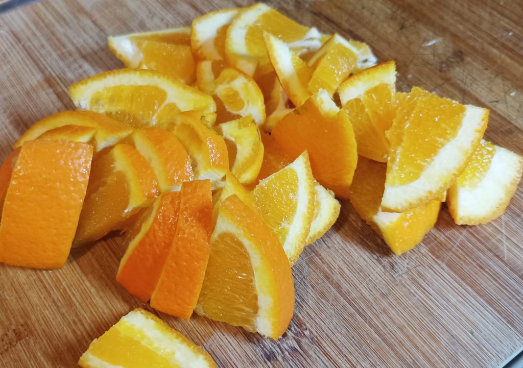 Comece lavando e cortando as laranjas ao meio, depois fatie-as e divida cada fatia novamente ao meio. Coloque as laranjas em uma panelinha e adicione o açúcar.