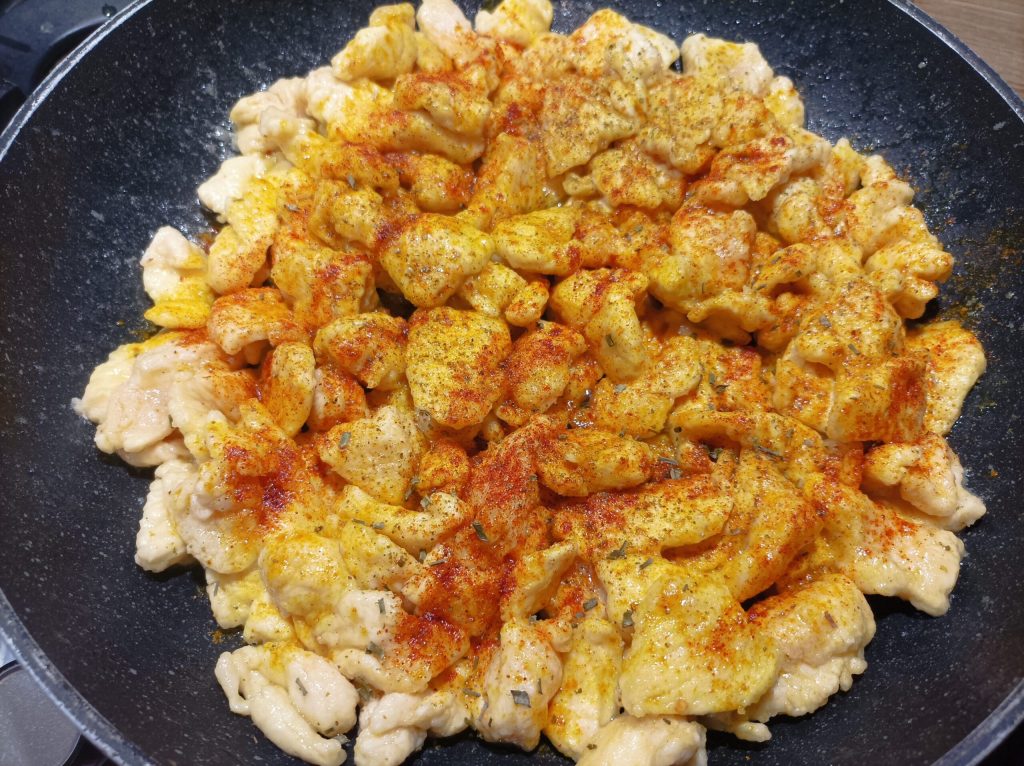 Comece cortando o peito de frango em pedaços, não muito grandes. Depois enfarinhe bem para que fiquem secos e cobertos de farinha. Prepare os pimentões, lave-os, remova as sementes e o pedúnculo, corte-os primeiro ao meio e depois em fatias finas de cerca de meio centímetro.