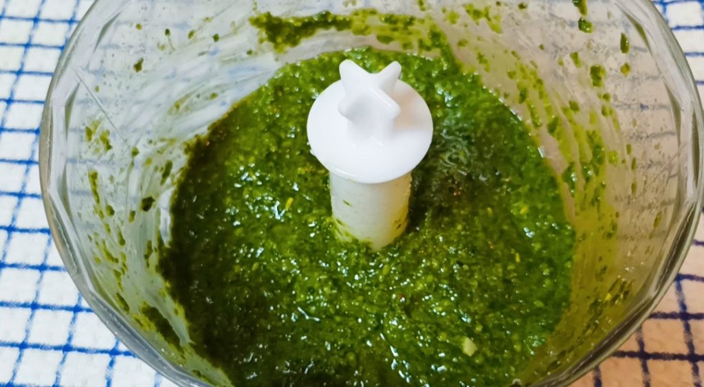 Quando o pesto estiver pronto, coloque-o em um recipiente de vidro, despeje um pouco de óleo para cobrir toda a superfície e feche.