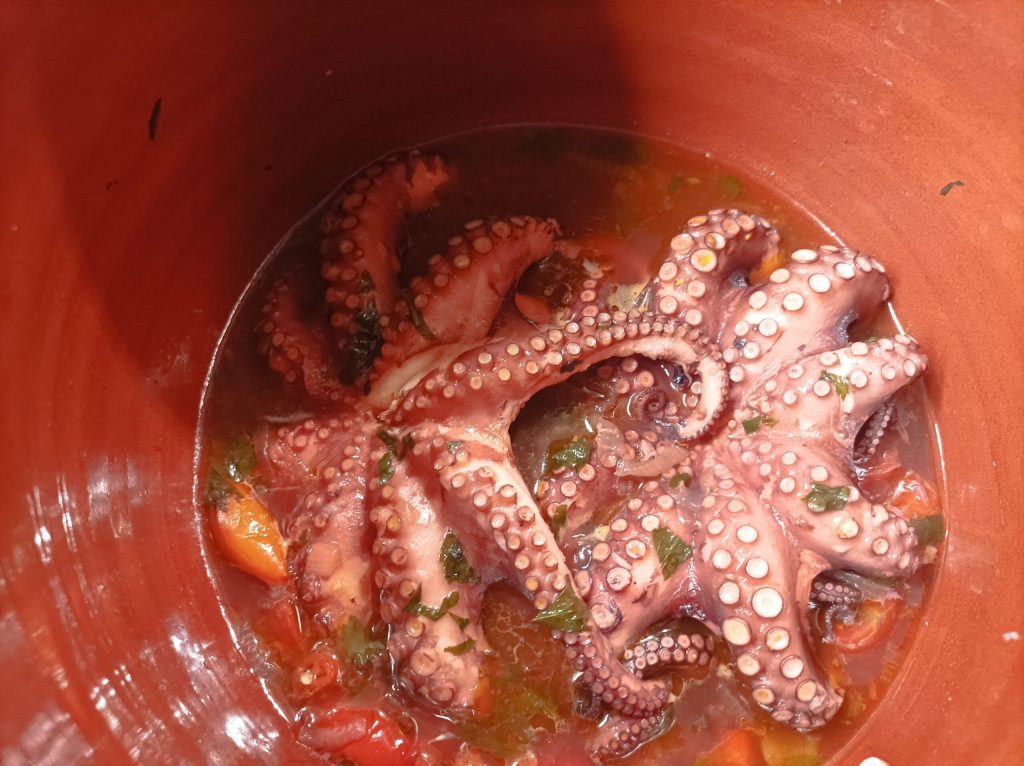 Os polvos na água deles chamados em Bari L pulp in da l’acqua lor. Um prato típico da tradição pugliese, preparado com ingredientes muito simples cozidos na sua água que soltará durante o cozimento. Esta expressão nós de Bari também utilizamos para definir alguém muito rabugento e intratável, então deve-se deixar “cozinhar no seu próprio caldo”. Em Bari encontramos os polvos já enrolados em todas as peixarias, mas se isso não for possível, basta escaldar os tentáculos em água fervente. O polvo é cozido de diversas formas: com batatas, com molho, assado, frito, em salada, etc., mas a melhor maneira de saboreá-lo é comê-lo cru. É um alimento que nunca falta, especialmente nos dias de festa. Nesta receita, o polvo ficará macio e saboroso, graças também à cocção no tacho de barro. Agora deixo vocês com a receita. Experimentem!!