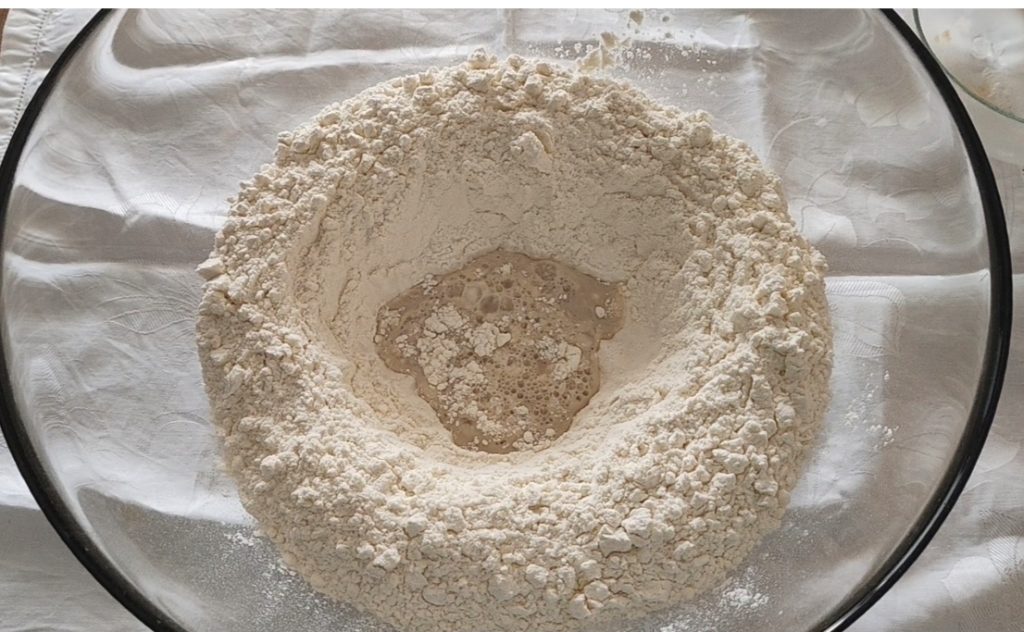 Em uma tigela coloque a farinha, dissolva o fermento em uma parte da água que será utilizada e adicione à farinha, mexa com a ajuda de um garfo, depois comece a despejar a água aos poucos, depois o sal e continue a misturar, o açúcar e a água restante. Agora, com a ajuda de um batedor ou com a mão, bata bem a massa que ficará muito fluida, até que fique homogênea, cerca de 10 minutos, desta forma também incorporará ar.