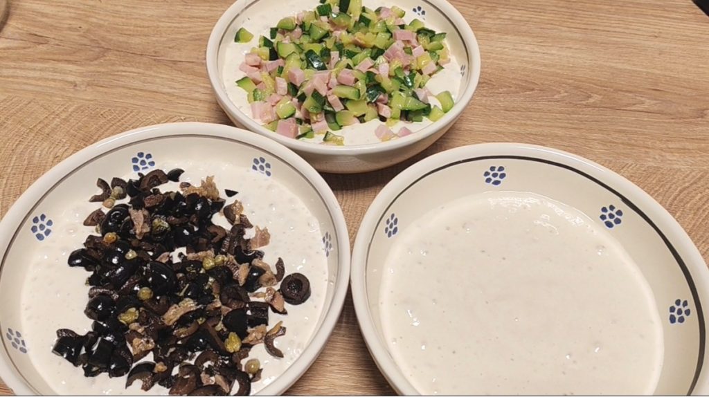 Passado o tempo, se você decidiu adicionar algum recheio, divida a massa de acordo com as variantes, eu dividi em 3 partes iguais. Insira os ingredientes escolhidos, misture, cubra e deixe descansar por mais 30 minutos. (Se você também escolher adicionar a abobrinha, lave-a, corte em cubinhos pequenos e passe na frigideira com um fio de óleo por 10 minutos).