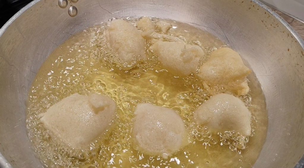 Com a ajuda de 2 colheres untadas de óleo, pegue com uma um pouco de massa e deixe escorregar com a outra colher no óleo quente, coloque 5/6 peças por vez. Escorra e coloque sobre papel absorvente.