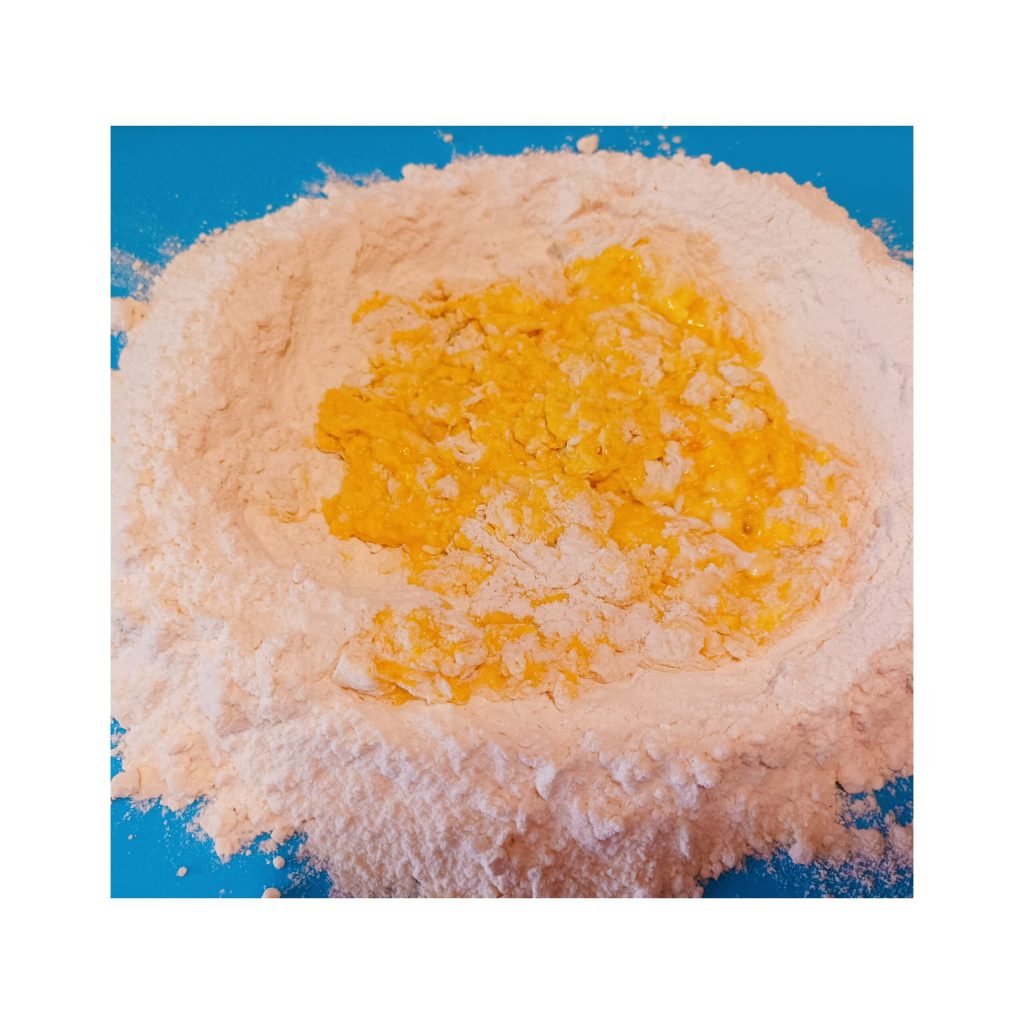 Coloque a farinha sobre uma superfície, abra um espaço no centro e adicione os ovos em duas vezes, o sal e comece a trabalhar incorporando aos poucos a farinha das bordas.