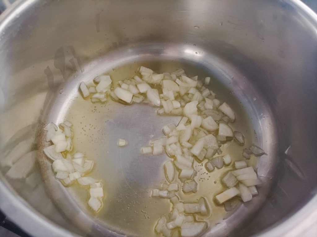 Primeiro, prepare o caldo e mantenha-o à parte. Em uma panela, coloque azeite suficiente para cobrir todo o fundo e a cebola picada em pedaços.