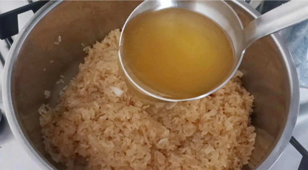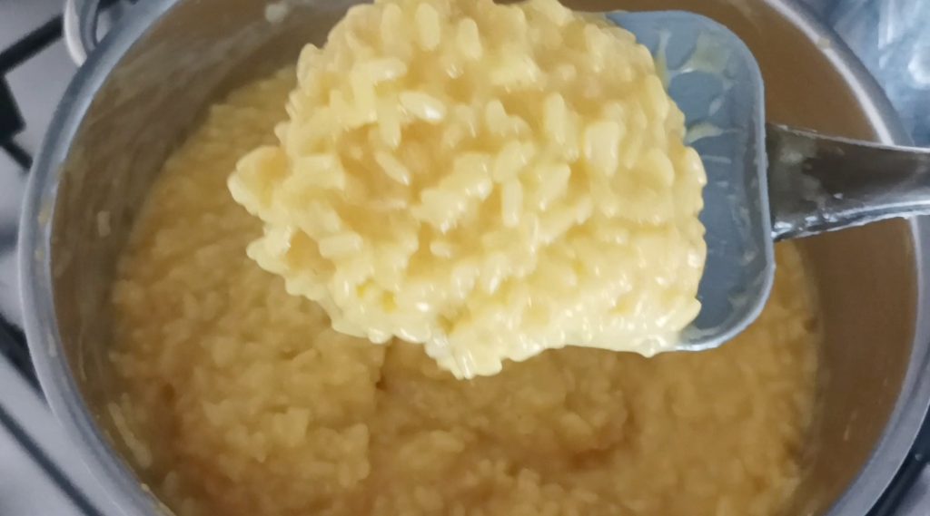Neste ponto, desligue o fogo e adicione a manteiga fria em pedaços e o queijo parmesão ralado, misture bem, dando a cremosidade adequada (se necessário, adicione um pouco de caldo).