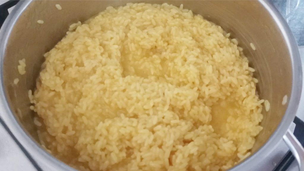 Quando a cebola estiver bem murcha, adicione o arroz e torre-o por alguns minutos em fogo baixo, depois aumente ligeiramente o fogo e despeje o vinho, deixando evaporar. Abaixe o fogo e comece a preparação do risoto, adicionando as primeiras conchas de caldo e continuando até o final do cozimento.