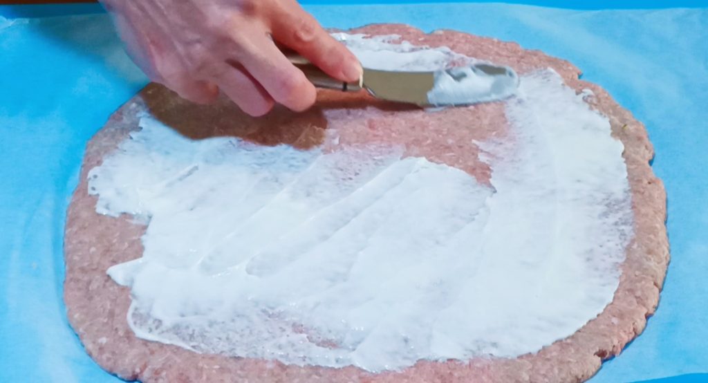 Tempere a carne com sal e forme uma bola. Sobre uma superfície de trabalho, coloque uma folha de papel manteiga, coloque a carne e cubra com outra folha de papel manteiga, depois abra a carne com uma espessura de cerca de 5 mm.