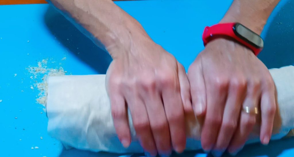 Feche o rocambole com a ajuda do papel manteiga, selando bem.