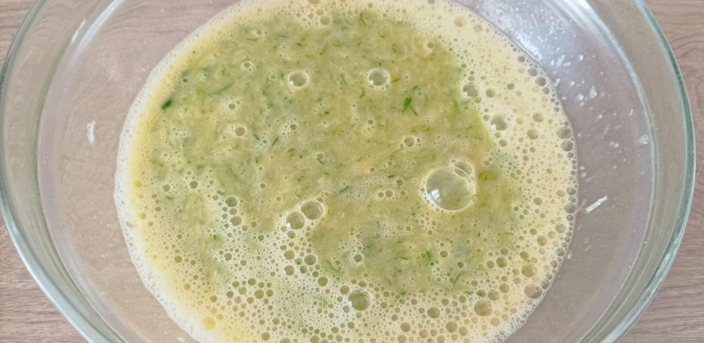 Enquanto isso, bata os ovos e tempere-os com parmesão, sal e pimenta. Após alguns minutos, esprema um pouco as abobrinhas pressionando com as mãos e adicione-as aos ovos. Misture bem.