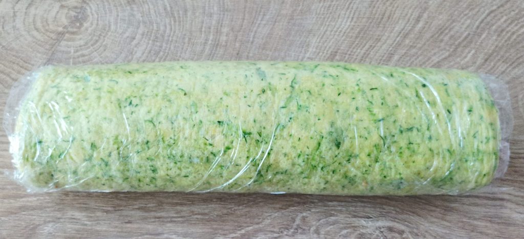Enrole a partir do lado mais curto, mantendo o rolo bem apertado, e feche-o no filme plástico. Deixe descansar por cerca de 30 minutos para que fique bem firme e saboroso.