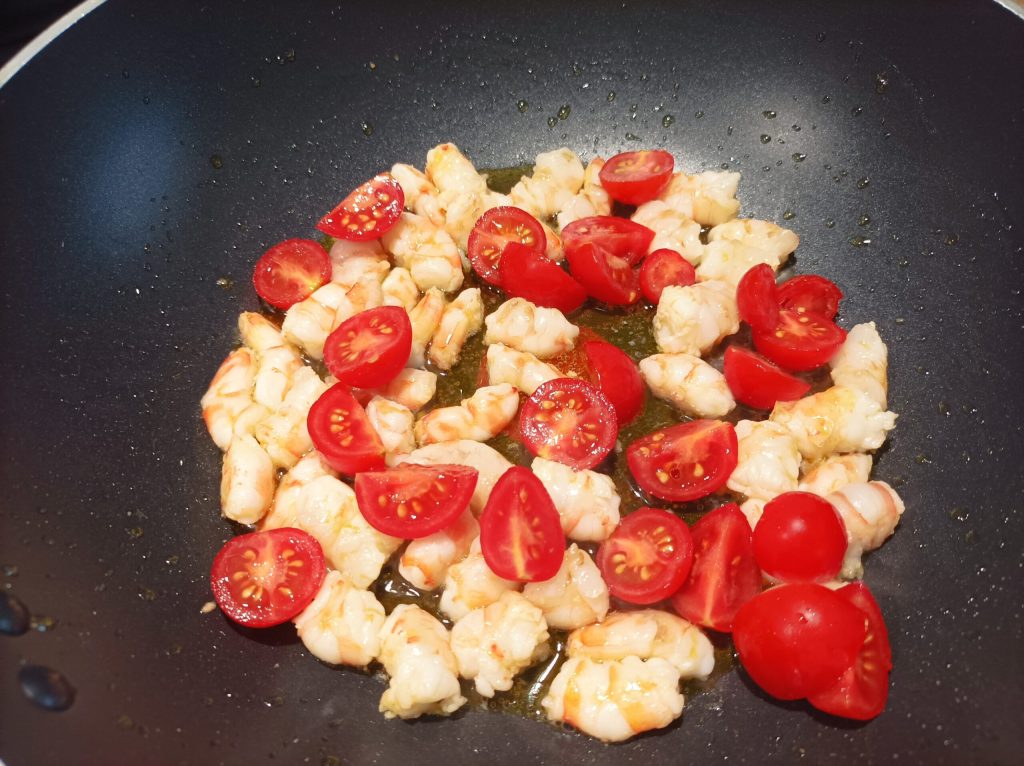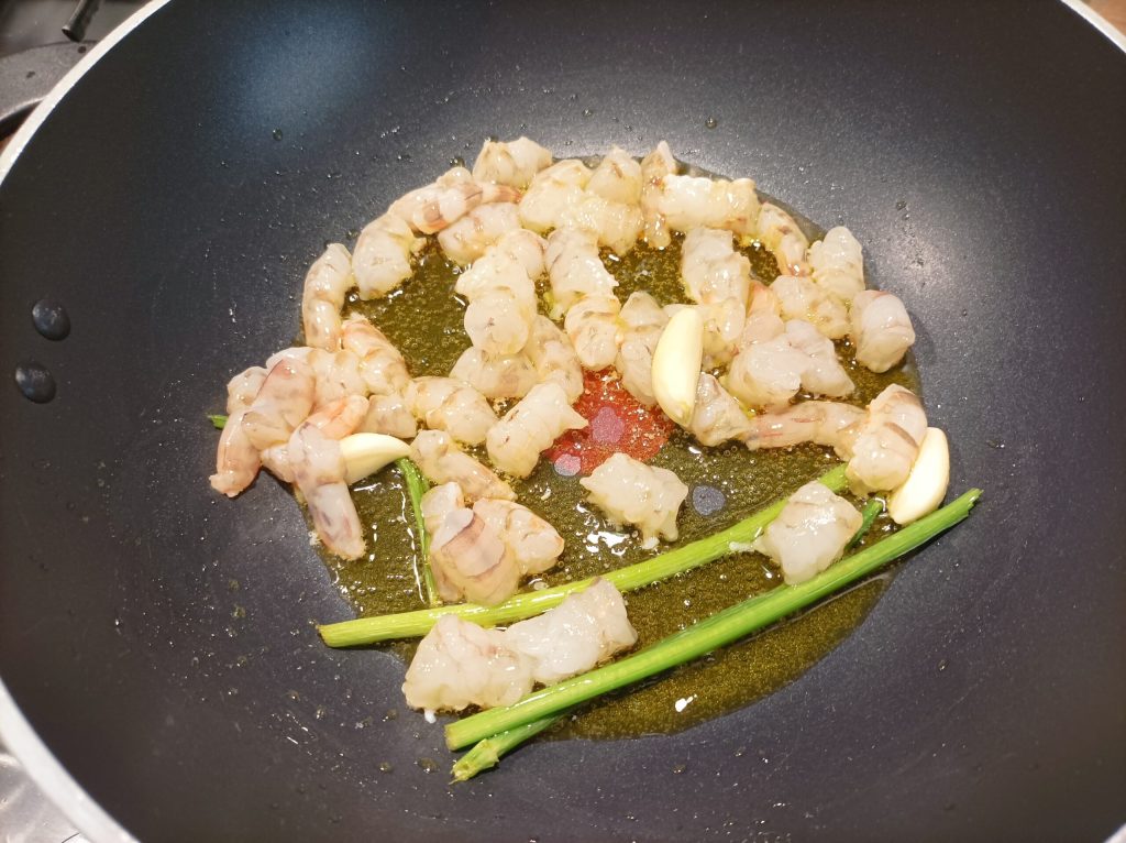 Depois corte os camarões em pedaços não muito pequenos. Enquanto prepara o molho, coloque água para ferver para o spaghetti.