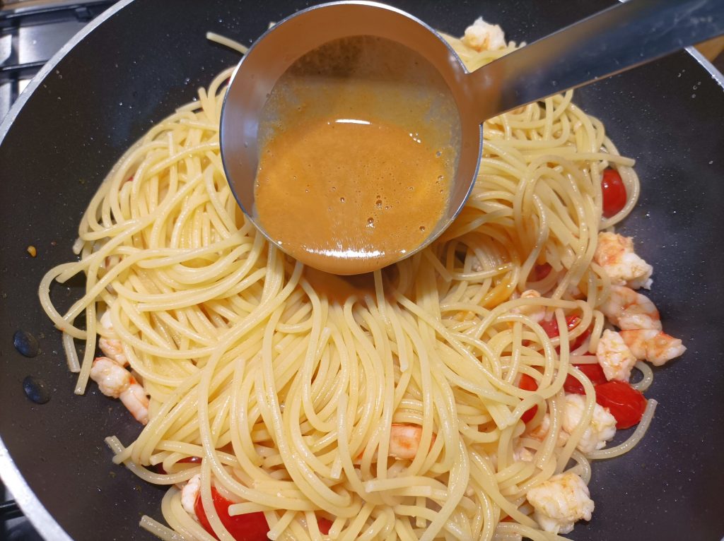 Após alguns minutos, escorra o spaghetti reservando a água do cozimento e coloque-o na frigideira com os camarões, adicione o bisque e um pouco de água do cozimento e comece a risotar o spaghetti.
