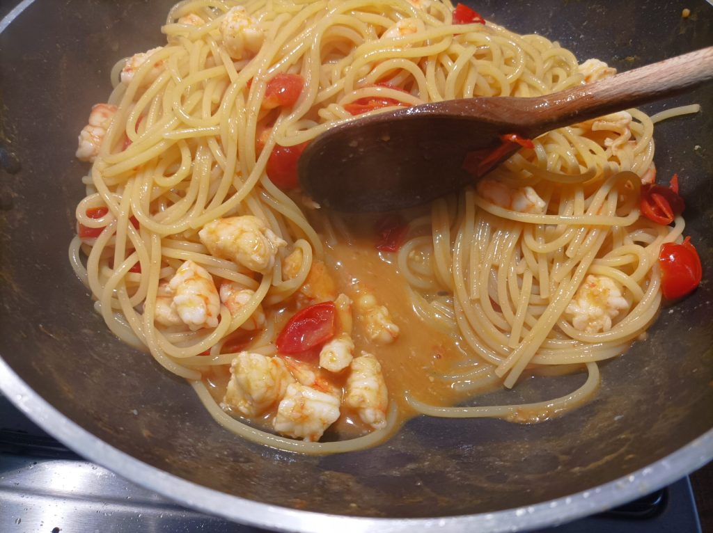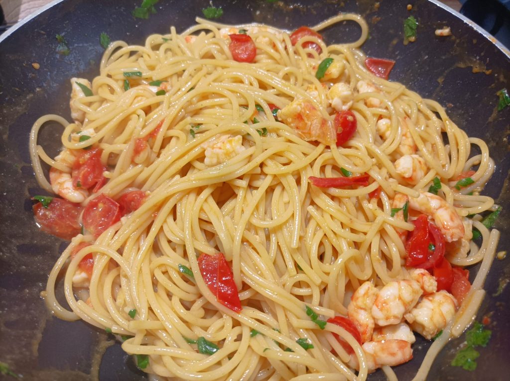 Os spaghetti com camarões estão prontos.
