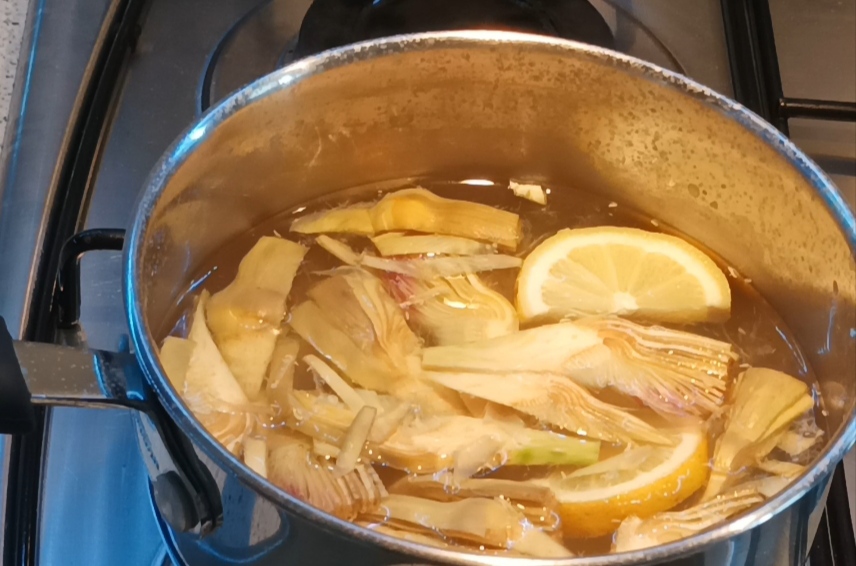 Coloque água, sal e a fatia de limão em uma panela pequena, deixe ferver. Limpe as alcachofras e corte o talo, corte-as primeiro ao meio e depois em fatias finas e mergulhe-as na água com limão fervente, escalde por 1 minuto. Em seguida, escorra e reserve.
