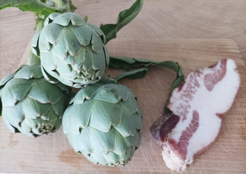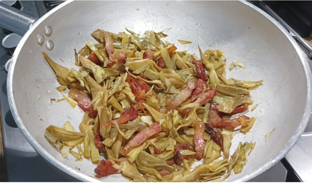 Ao final do cozimento das alcachofras, adicione o guanciale que você reservou, misture, prove o sal e desligue.