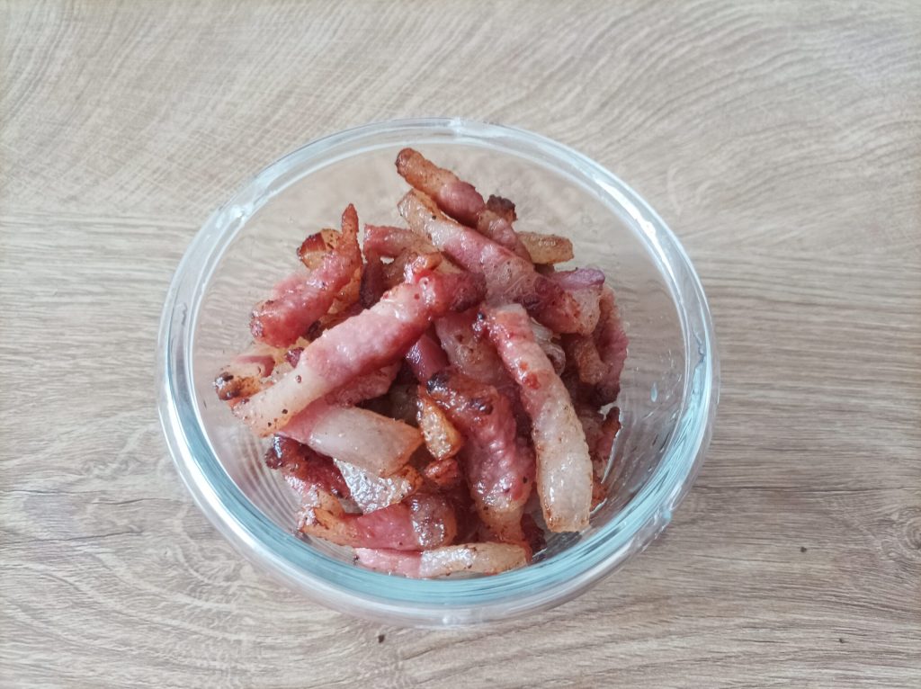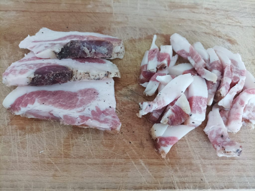 Pegue o guanciale e retire a pele e o excesso de pimenta e corte-o em tiras.