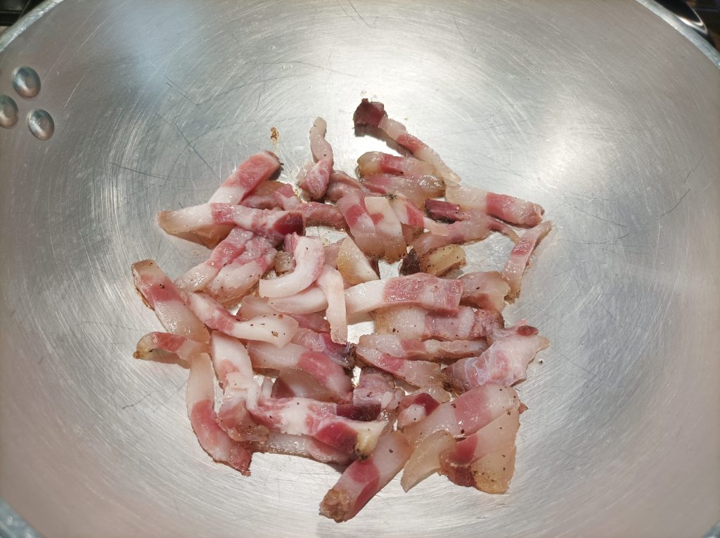 Aqueça a frigideira e coloque o guanciale dentro, tostando-o e deixando que seu gordura derreta em fogo baixo.