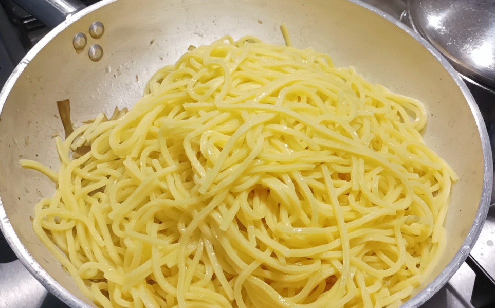 Neste ponto a água para a massa estará pronta, adicione sal e coloque os tonnarelli. Cozinhe-os por alguns minutos e termine o cozimento dentro das alcachofras e guanciale, reservando um pouco de água do cozimento.