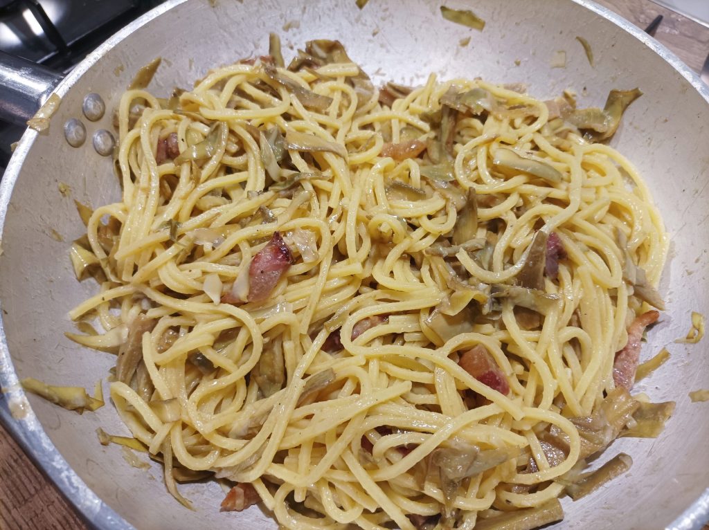 Os tonnarelli guanciale alcachofras e pecorino estão prontos! Bom apetite!!