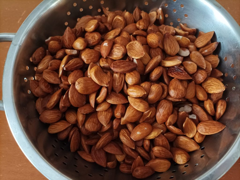 Em uma panela, coloque água para ferver, depois desligue e coloque as amêndoas dentro. Deixe de molho por alguns minutos.