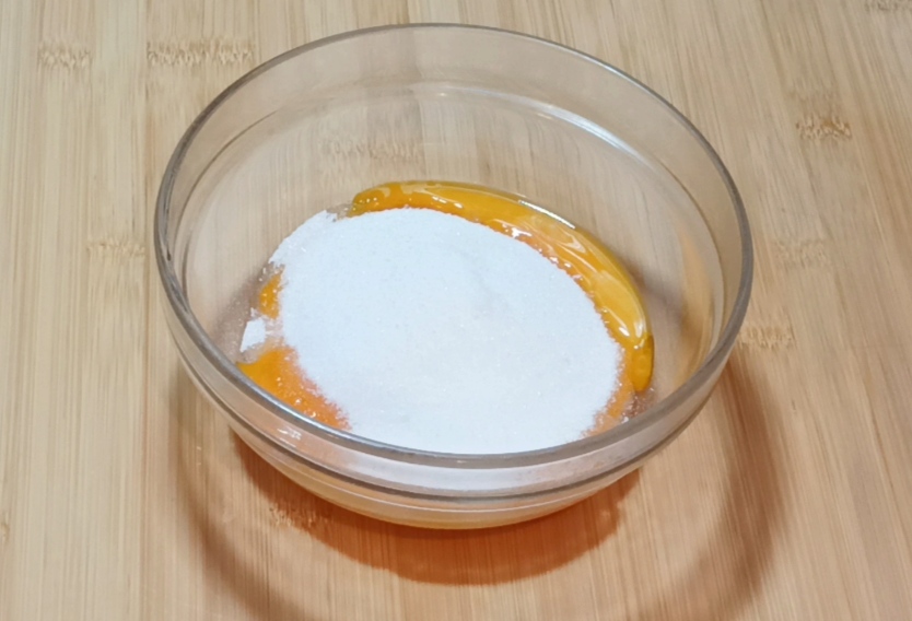 Separe as gemas das claras. Em um recipiente, coloque gemas e açúcar.