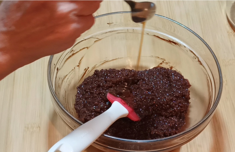 Adicione a essência de baunilha no chocolate e amêndoas. Misture e reserve.