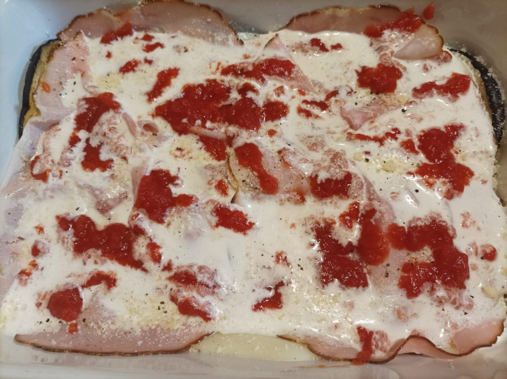 Depois galbanone, presunto cozido, parmesão, polpa de tomate, creme de leite, sal e pimenta.