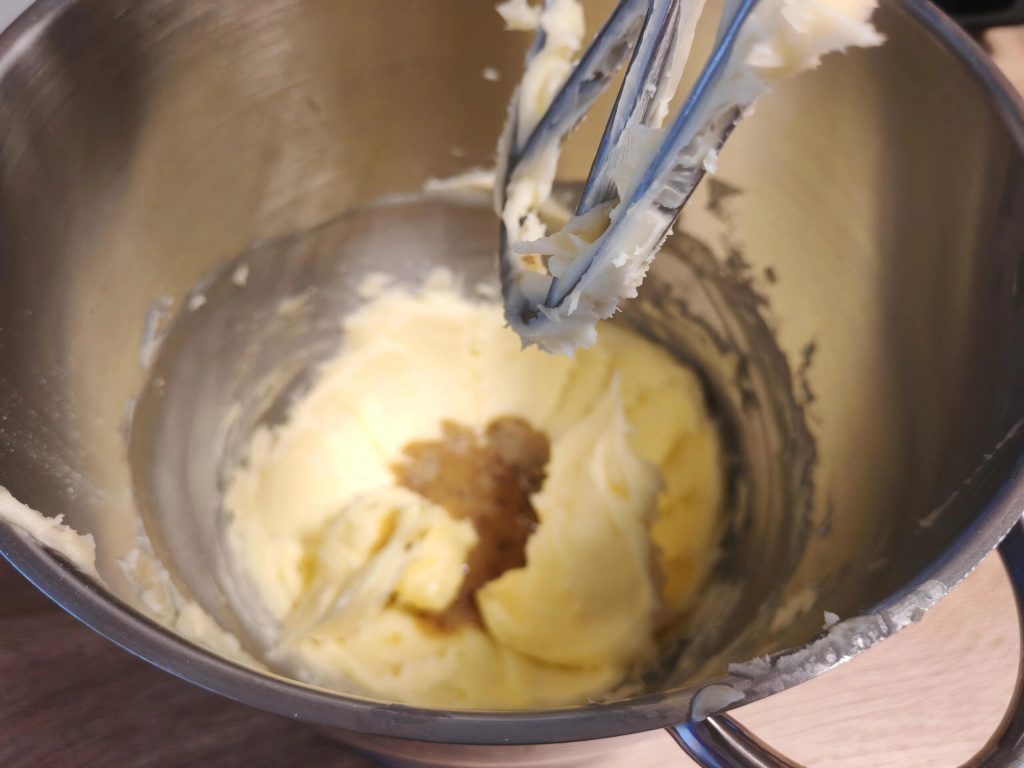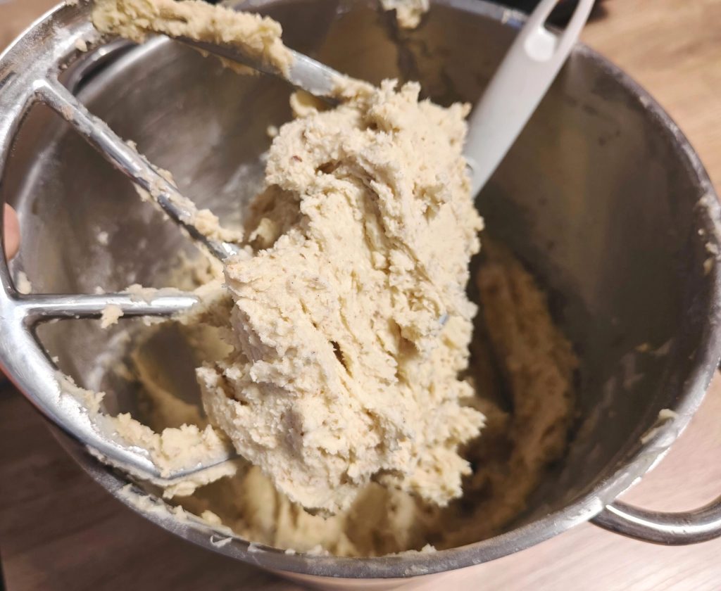 Agora adicione parte dos ovos e trabalhe por alguns segundos; se perceber que a massa está grudando nas paredes da batedeira, ajude com uma espátula, trazendo a massa para o centro. Acrescente o restante dos ovos e bata mais alguns segundos.