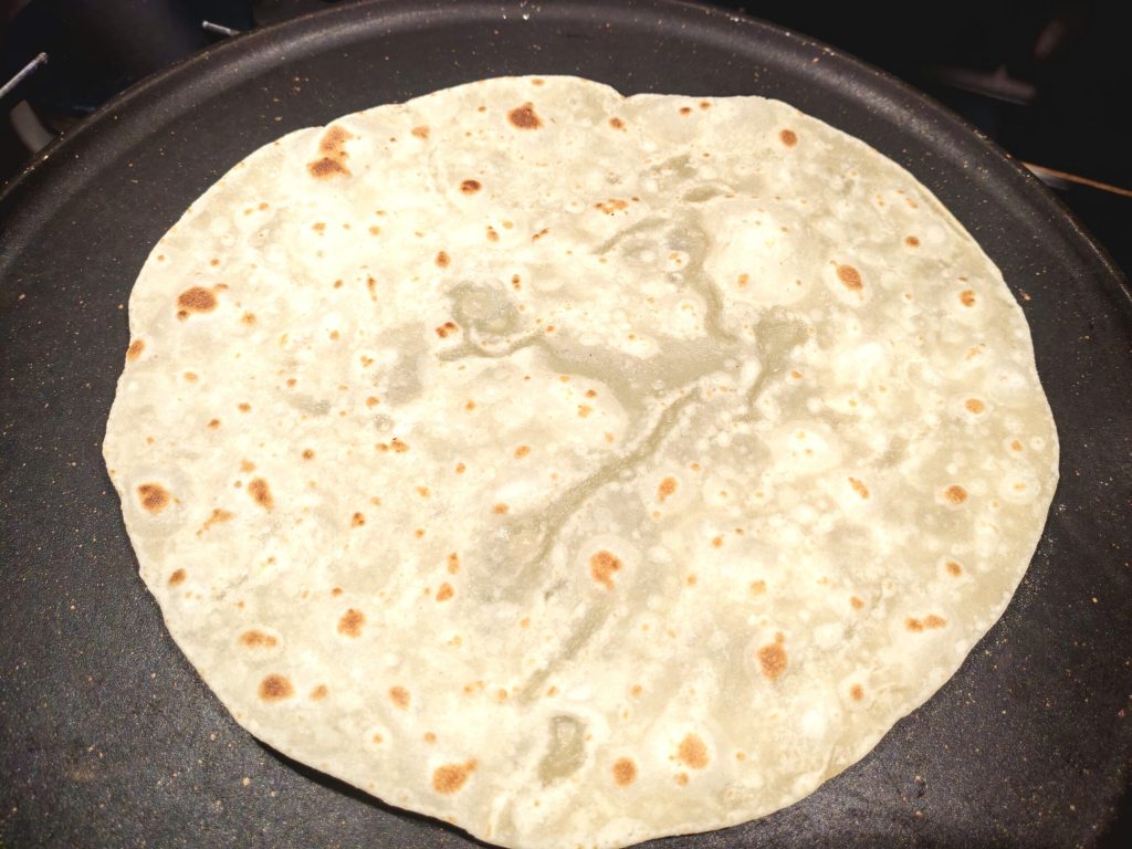 • Aqueça bem a chapa e coloque a tortilla, cozinhe por 1 minuto em fogo moderado.