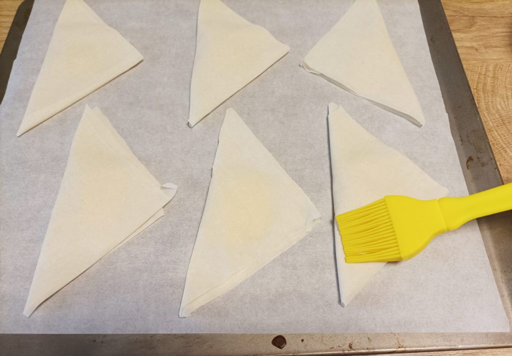 Os triângulos de massa filo devem ser consumidos no mesmo dia; caso contrário, perderão a crocância.