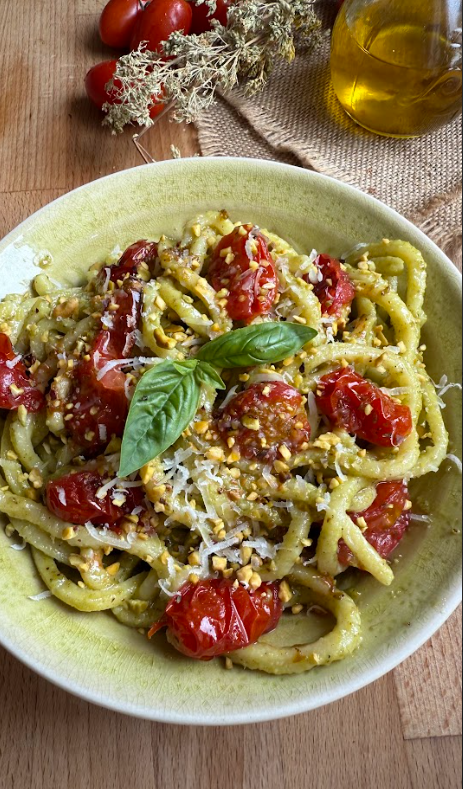 A delicadeza do pesto se combina com a frescura da massa al dente, enquanto os tomatinhos adicionam um toque de elegância e uma explosão de sabor. É uma receita que lembra o sol e a Sicília, perfeita tanto no verão quanto nos meses mais frios para evocar os aromas mediterrâneos.