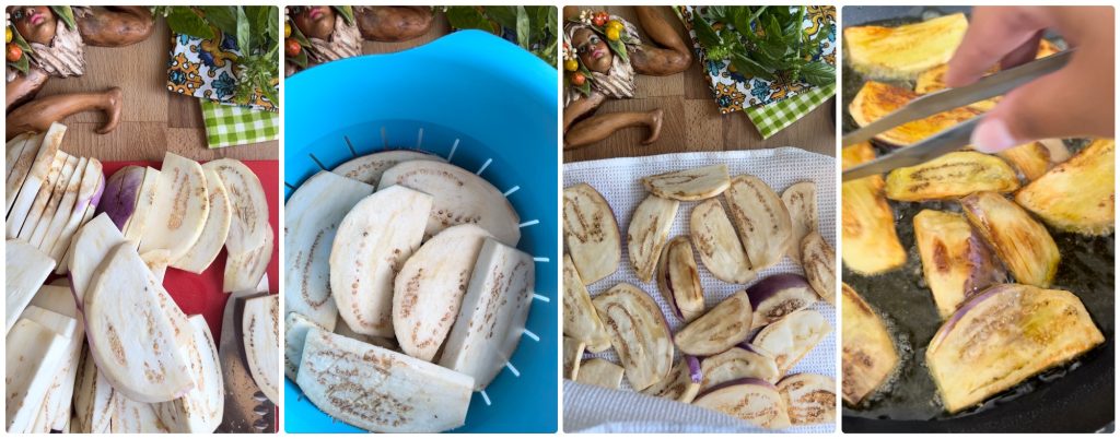 Para preparar a parmigiana de berinjela siciliana tradicional, são necessários poucos ingredientes, todos de ótima qualidade: boas berinjelas que devem ser absolutamente FRITAS, uma mozzarella fior di latte de boa qualidade, parmesão, muito manjericão, de preferência recém-colhido, e um bom molho de tomate e manjericão, que as avós faziam especialmente começando pelos tomates e passando-os pelo passador de legumes, outra história.