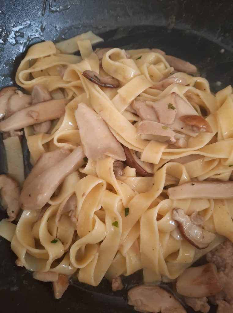 Tagliatelle com cogumelos porcini congelados sem creme de leite, um prato principal da grande tradição italiana, realizável em qualquer época do ano, cheio de sabor e aromas.