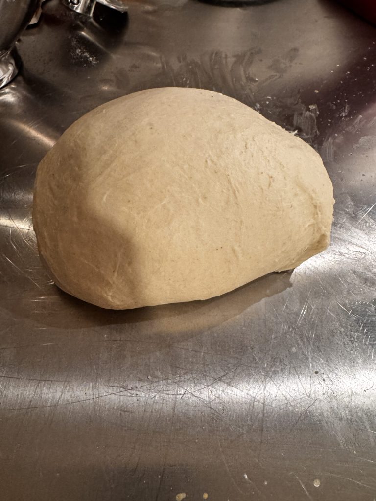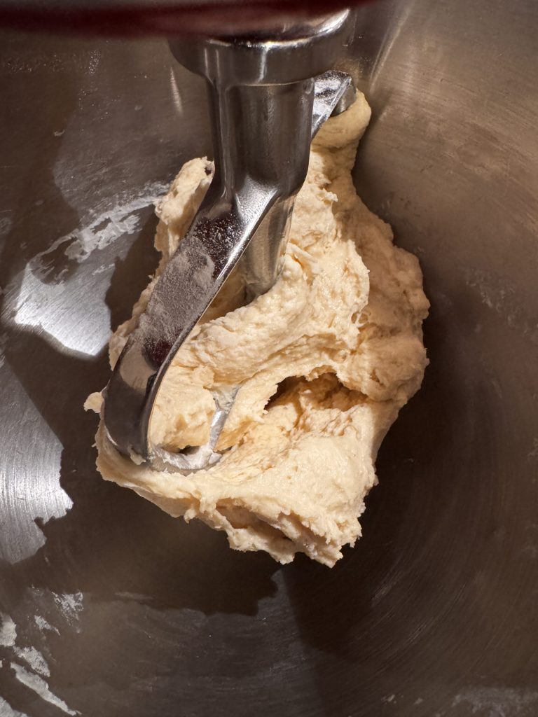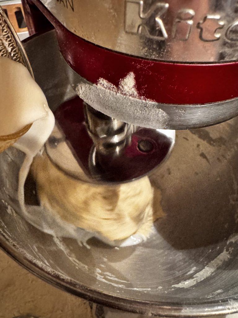 Adicionar o leite (ou a bebida vegetal) em pelo menos duas vezes, tendo o cuidado de absorver e deixar a massa enrolar antes de prosseguir com a próxima parte de leite. A batedeira deve ir em velocidade mais alta quando deve enrolar e mais lentamente quando o leite é inserido.