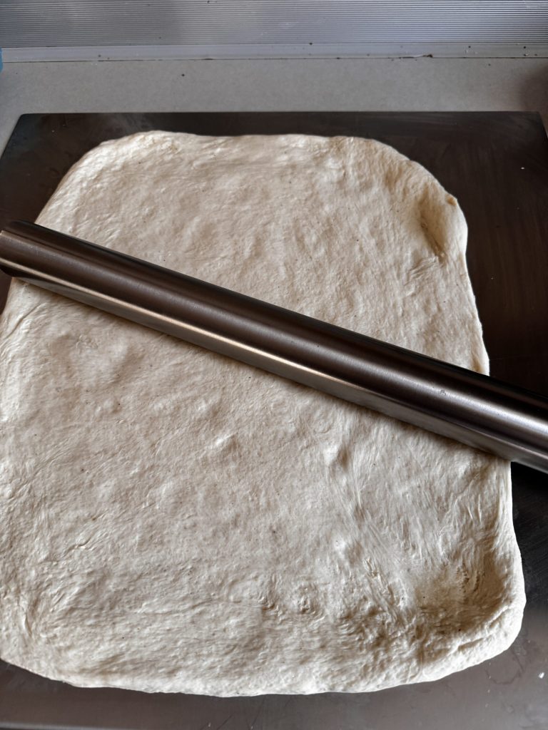 Com o rolo de massa, fazer um grande retângulo de pelo menos 30×40 cm