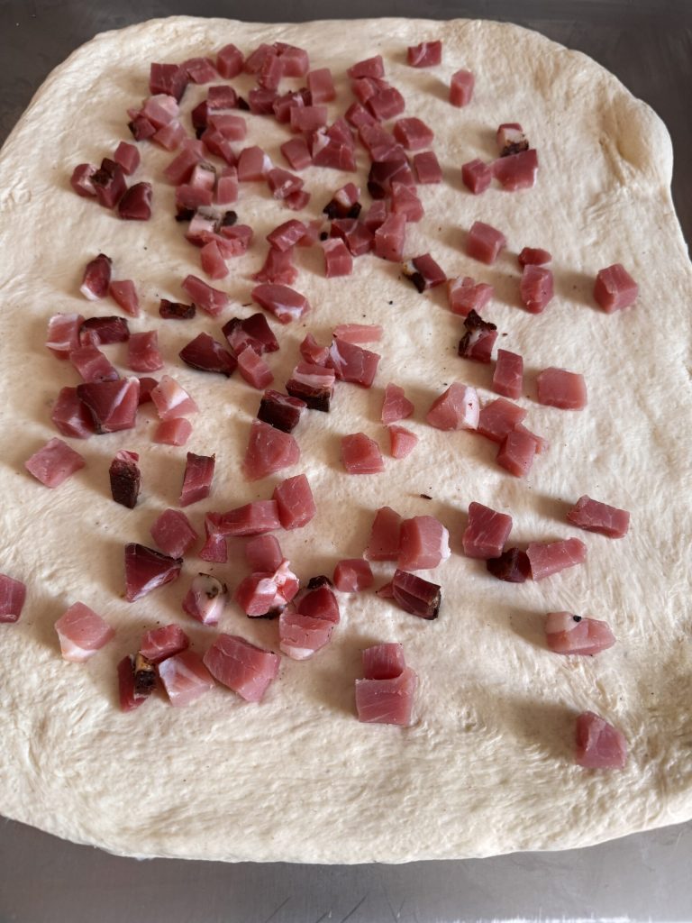 Começar a rechear espalhando a massa com os cubos de speck. Deixar dois dedos de espaço todo ao redor.
